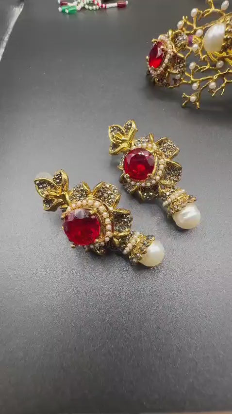 Elegant Turkish craftsmanship Rich red stone embellishments Includes matching earrings for a complete look